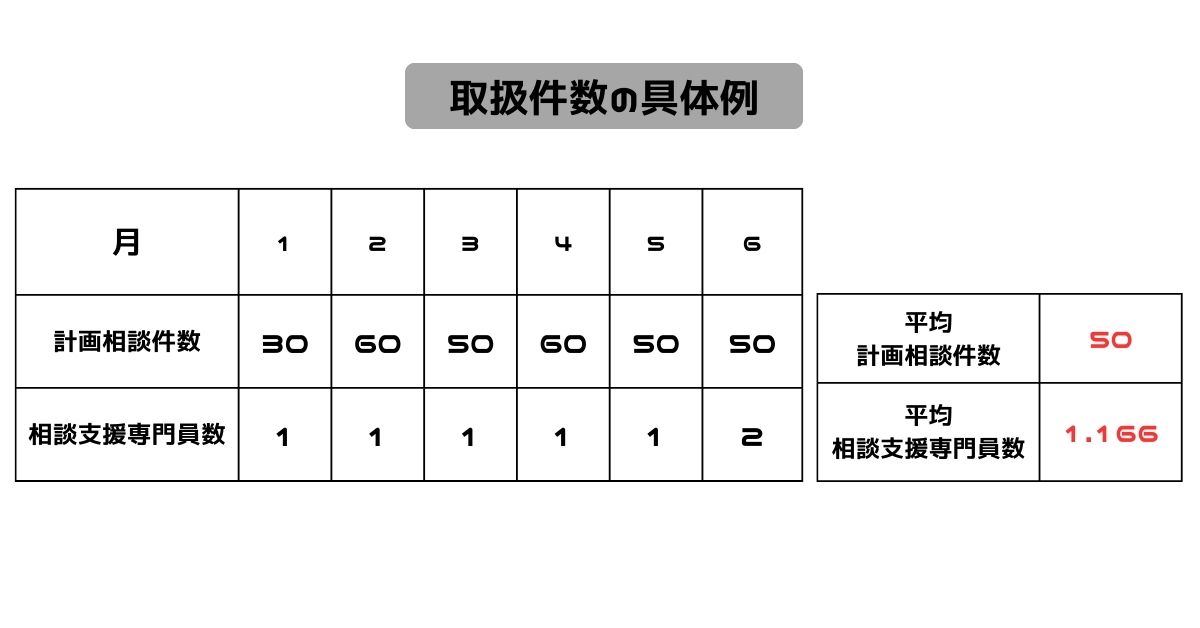 【平均計画相談件数 50件】 ÷ 【平均相談支援専門員数 1.166人】 = 42.881件(取扱件数)