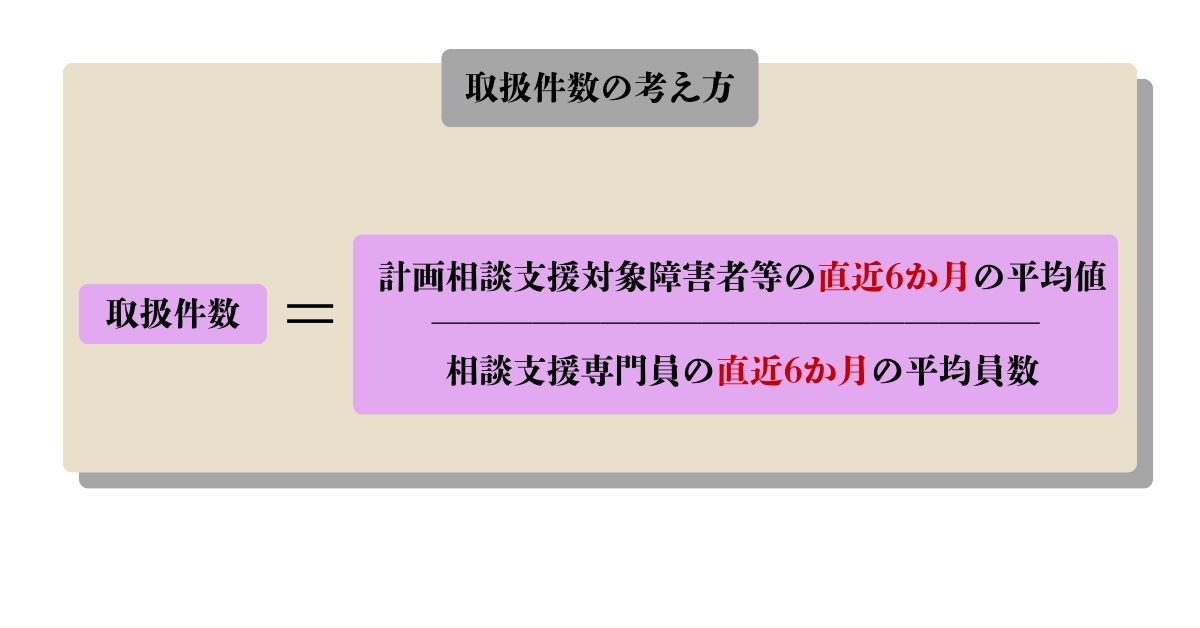 事業所ごとの「取扱件数」は、計画相談支援の対象となる障害者等の人数を当該事業所に配置されている相談支援専門員の平均員数で割って算出します。