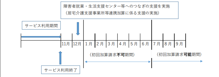 介護保険サービスへの移行や就職などにより、障害福祉サービスの利用を終える際に、居宅介護支援事業所や就職先の事業所、障害者就業・生活支援センターなどへ引き継ぐために、一定の期間を要する者に対し、次の①~⑥のいずれかの支援業務を行った場合