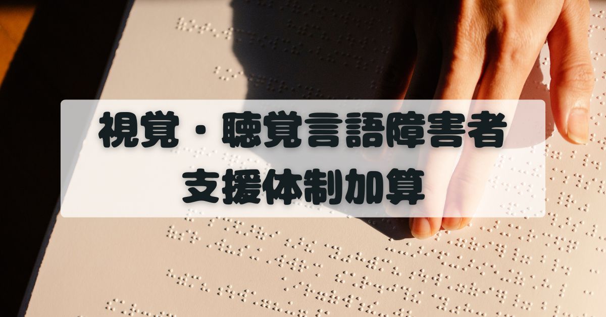 更新日:視覚・聴覚言語障害者支援体制加算視覚・聴覚言語障害者支援体制加算とは、視覚、聴覚、または言語機能に重度の障害がある利用者に対して、より手厚い支援体制を整えている事業所が算定できる加算です。対象となる事業所では、重度障害者の受入割合や、専門性を有する職員の配置状況に応じて、(Ⅰ)または(Ⅱ)に...